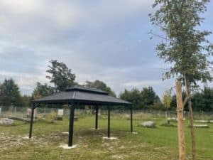 Seit 15. September steht nun ein knapp 4 × 6 m großer Pavillon auf der Hundewiese. Nun ist für Schatten und Wetterschutz von oben gesorgt!